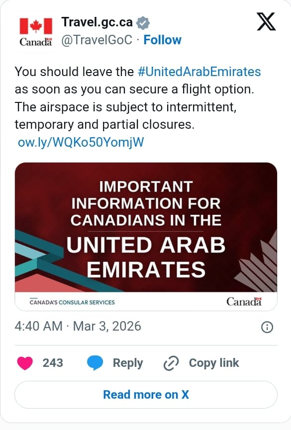 Canadian authorities specifically advised citizens currently in Dubai not to wait for special evacuation flights. Instead, they recommended leaving through available commercial means or traveling by land to neighboring countries such as Saudi Arabia or the Oman if feasible.