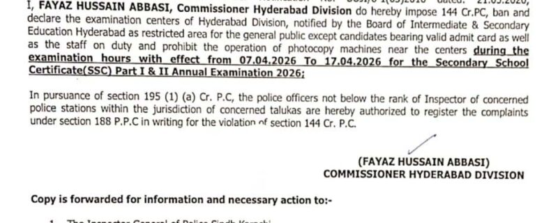 HYDERABAD (HRNW): Commissioner Hyderabad Division, Fayaz Hussain Abbasi, has announced stringent security and administrative measures to ensure the peaceful and transparent conduct of the Secondary School Certificate (SSC) Part I and II Annual Examinations 2026. According to the official notification issued upon the request of the Chairman of the Board of Intermediate and Secondary Education Hyderabad, Section 144 has been imposed across the division and will remain in effect from April 7 to April 17, 2026. Under these regulations, all examination centers have been declared “Restricted Areas” where entry is strictly limited to candidates carrying original admit cards and authorized staff on duty, while the general public is completely prohibited from entering the premises. Furthermore, all photostat machines located in the vicinity of examination centers are ordered to remain closed during exam hours to prevent any illegal activity or the reproduction of question papers. Police officers of Inspector rank and above have been empowered to take strict legal action and register FIRs under Section 188 of the Pakistan Penal Code against anyone found violating these orders. Copies of the directive have been dispatched to the IG Sindh, DIG Hyderabad, and all relevant Deputy Commissioners to ensure immediate implementation and maintain the sanctity of the academic process.