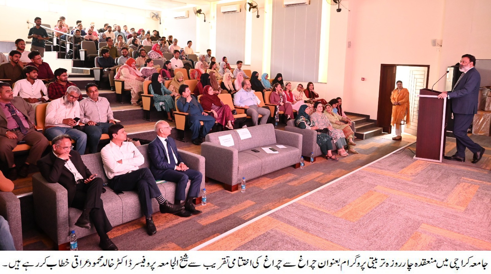 Addressing students, he urged them not to confine their education and training to themselves but to share it with society, as knowledge grows when it is spread. He expressed these views at the award and certificate distribution ceremony marking the conclusion of the four-day training program “Charagh se Charagh” (Light from Light) Youth Leadership and Civic Engagement Program, organized by the University of Karachi’s Office of Research Innovation and Commercialization in collaboration with the Center for Peace and Development Initiatives and the International Foundation for Electoral Systems, held at the Zafar H. Zaidi Center for Proteomics Auditorium.
