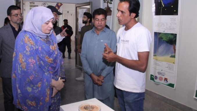 Jamshoro (HRNW)- Shaheed Allah Buksh Soomro (SABS) University of Art, Design and Heritages, Jamshoro, held an exhibition of ceramic pots and plates adorned with exquisite Turkish calligraphy at the AR Nagori Gallery. The event was inaugurated by Vice-Chancellor, Prof. Dr. Arabella Bhutto, as part of the Turkish National Day celebration week, emphasizing cultural exchange and artistic collaboration.