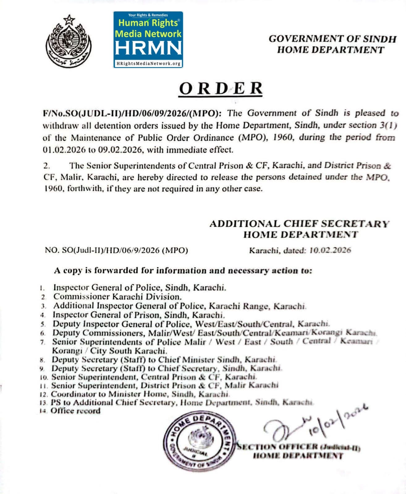 Karachi (HRNW): In a significant decision, the Sindh government has immediately withdrawn all detention orders issued under the Maintenance of Public Order (MPO) between February 1 and February 9, 2026.