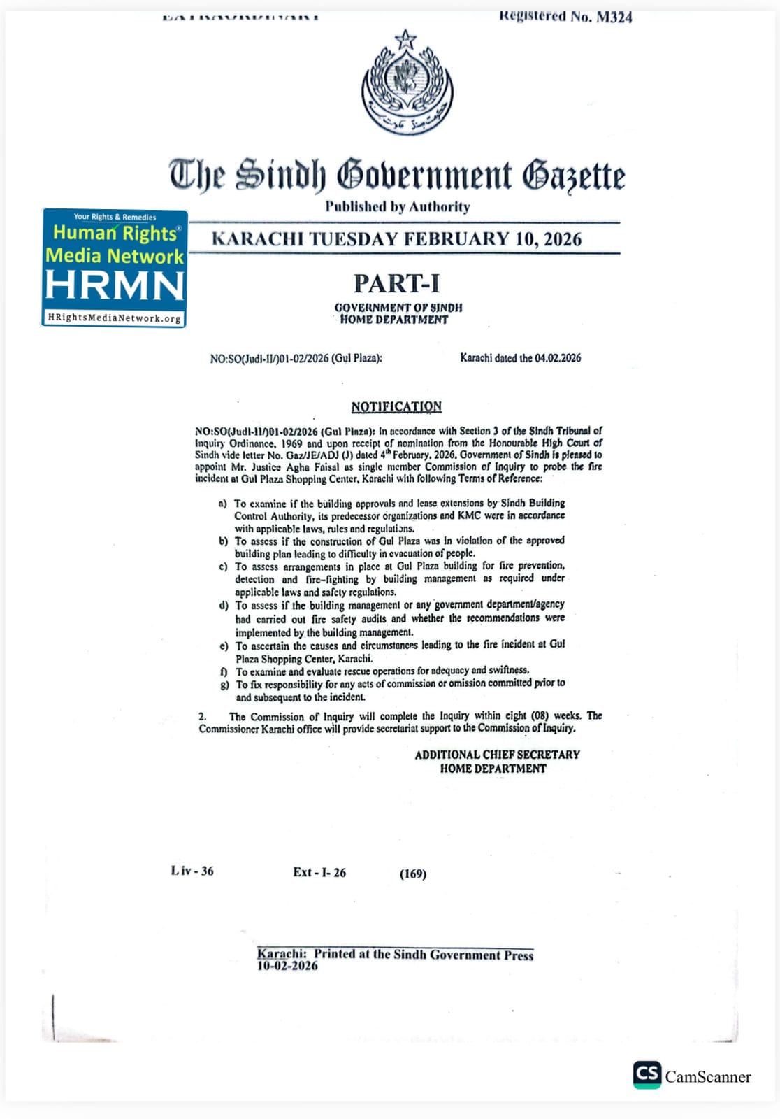 Karachi (HRNW): On the directives of Sindh Home Minister Zia-ul-Hassan Lanjar, a major development has taken place in the Gul Plaza fire tragedy case, with the formal establishment of an Inquiry Commission to investigate the incident. The Sindh government has issued an official notification in this regard.