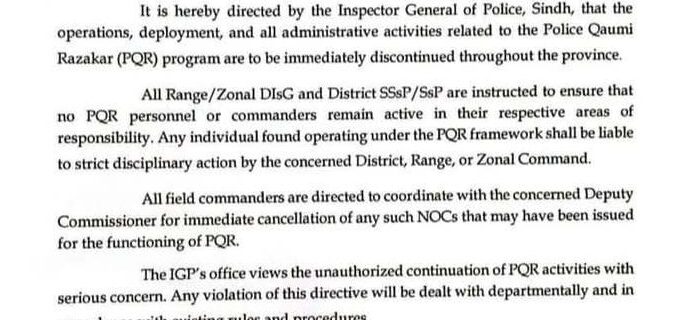 Karachi (HRNW)- Police National Volunteer (PQR) chapter closed, activities ordered to be stopped immediately, IG Sindh issues official notification The activities of the Police National Volunteer (PQR) program are now a thing of the past. The Inspector General of Police Sindh has issued an official notification on July 27, 2025, ordering the immediate cessation of all deployments, operations and administrative activities related to PQR across the province.