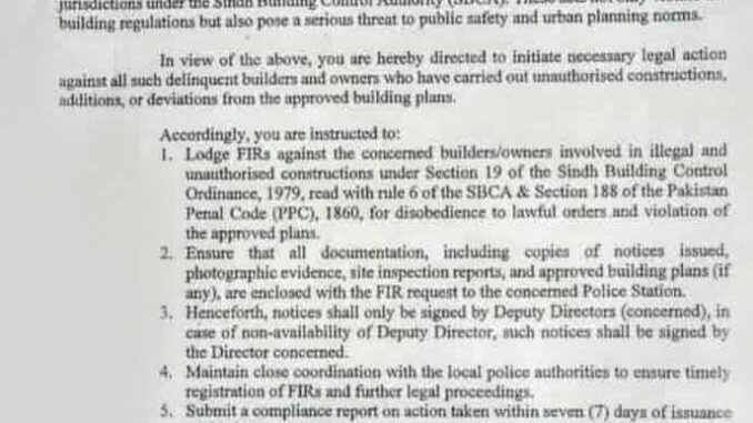The directive issued by Director General SBCA Shah Mir Khan Bhutto has directed all regional directors to immediately file FIRs against all persons who are carrying out construction without approval, deviation from the map or other violations.