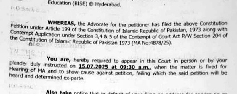 حیدرآباد(ایچ آراین ڈبلیو)ہائی کورٹ نے 26 جون کو کیس نمبر 1037 CP. کی سماعت کرتے ہوئے چیئرمین حیدرآباد تعلیمی بورڈ سہیل انور بلوچ اور ڈپٹی سیکرٹری بورڈ شاہ نواز بھٹی کو توہین عدالت ایکٹ دفعہ 204 کے تحت عدالتی حکم پر عمل نہ کرنے کے شواہد کی روشنی میں توہین عدالت کے نوٹیسز جاری کرتے ہوئے ذاتی حیثیت میں 15 جولائی کو ہائی کورٹ حیدرآباد میں طلب کرلیا-
