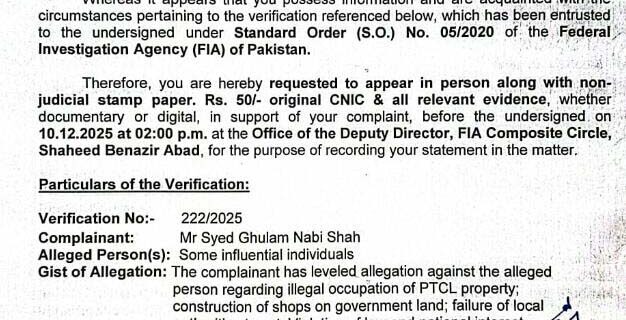 ذرائع کے مطابق سید غلام نبی شاہ نامی شہری نے ایف آئی اے میں شکایت درج کروائی تھی کہ بااثر افراد نے پی ٹی سی ایل کی ملکیتی زمین پر ناجائز تجاوزات قائم کر رکھی ہیں اور غیر قانونی دکانیں تعمیر کی جا رہی ہیں۔