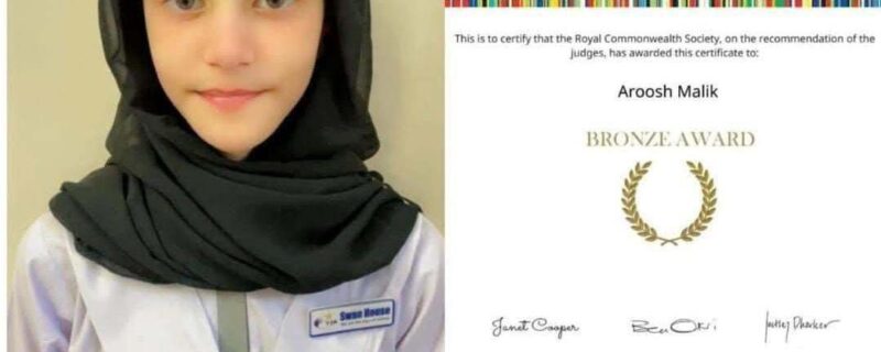 سکھر(ایچ آراین ڈبلیو)اروش ملک، 11 سالہ طالبہ اور سکھر کی رہائشی، نے انٹرنیشنل دی کوئنز کامن ویلتھ ایسے کمپٹیشن (The Queen’s Commonwealth Essay Competition) میں عالمی سطح پر تیسری پوزیشن حاصل کر کے برونز ایوارڈ جیتا، اور پاکستان کی تاریخ میں ایک نیا سنگِ میل قائم کیا۔