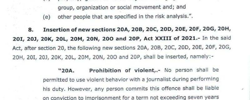 بل میں مزید کہا گیا ہے کہ کمیشن صحافی کی جائیداد، اشیاء، گروپس، تنظیموں اور سماجی تحریکوں کے تحفظ کے لیے بھی اقدامات کرے گا۔ دورانِ ڈیوٹی کسی شخص کو صحافی کے خلاف پرتشدد رویہ اختیار کرنے کی اجازت نہیں ہوگی، اور خلاف ورزی کی صورت میں مجرم کو سات سال تک قید اور تین لاکھ روپے جرمانے کی سزا دی جا سکے گی۔