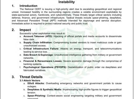ایڈوائزری کے مطابق ممکنہ سائبر حملوں کا ہدف حکومتی، دفاعی اور مالیاتی ادارے بن سکتے ہیں، جبکہ سرکاری سوشل میڈیا اکاؤنٹس کو بھی ہیک کیے جانے کا خطرہ موجود ہے۔ نیشنل سرٹ نے خبردار کیا ہے کہ دشمن عناصر کی جانب سے ڈیپ فیکس، اسپیئر فشنگ اور ڈی ڈی او ایس (DDoS) حملوں کے ذریعے نظام کو متاثر کرنے کی کوشش کی جا سکتی ہے۔