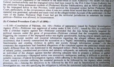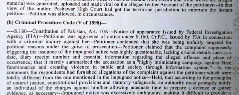 عدالت نے اپنے فیصلے میں زور دیا کہ آئین کا آرٹیکل 199 شہریوں کو تحفظ فراہم کرتا ہے۔ اگر FIA نوٹس میں بنیادی قانونی تقاضے پورے نہیں کیے گئے تو اسے اختیارات کا ناجائز استعمال تصور کیا جائے گا۔
