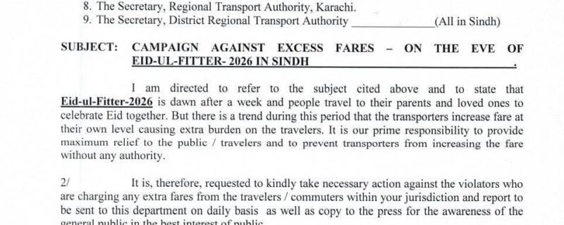 انہوں نے مزید کہا کہ مسافروں کو حکومت کے مقرر کردہ نرخوں پر محفوظ اور سہل سفر کی سہولت فراہم کرنا حکومت کی اولین ترجیح ہے۔ تمام متعلقہ اداروں کو متحرک رہنے اور عوامی شکایات کا فوری ازالہ یقینی بنانے کی ہدایت کی گئی ہے تاکہ عید کی خوشیوں کے موقع پر شہریوں کو کسی قسم کی ذہنی یا مالی پریشانی کا سامنا نہ کرنا پڑے۔