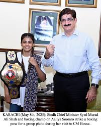 وزیراعلیٰ سندھ کی ورلڈ باکسنگ ٹائٹل جیتنے پر عالیہ سومرو کی حوصلہ افزائی ، وزیراعلیٰ سندھ کا چیمپئن باکسر عالیہ سومرو کےلیے 10 لاکھ روپے انعام کا اعلان ، وزیراعلیٰ سندھ نے پیشکش کی کہ اگر کوچ درکار ہو تو سندھ حکومت بندوبست کرے گی، ایشین گیمز کی تیاری کریں، آپ محنت کریں، سندھ حکومت سپورٹ کرے گی،