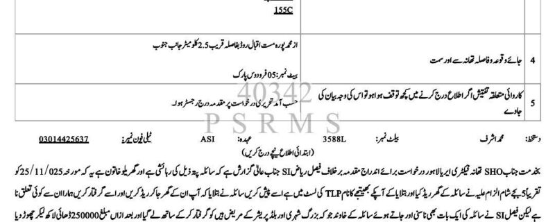 شکایت میں الزام تھا کہ سب انسپکٹر نے خاتون کے بھتیجے کا نام کالعدم تنظیم کی فہرست سے نکالنے کے لیے 2 لاکھ 50 ہزار روپے رشوت کے طور پر طلب کیے اور بعد میں مزید رقم کا تقاضہ کیا، ساتھ ہی خاتون کو ہراساں بھی کیا۔