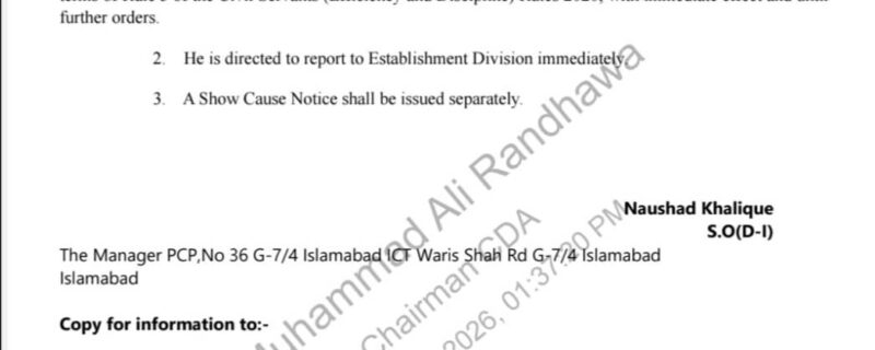 جاری کردہ اعلامیے کے مطابق وقاص علی خان، جو اس وقت کیپیٹل ڈویلپمنٹ اتھارٹی میں تعینات تھے، کو سول سرونٹس (ایفیشنسی اینڈ ڈسپلن) رولز 2020 کے تحت ابتدائی طور پر 120 دن کے لیے معطل کیا گیا ہے۔ معطلی کا اطلاق فوری طور پر ہوگا اور آئندہ احکامات تک برقرار رہے گا۔