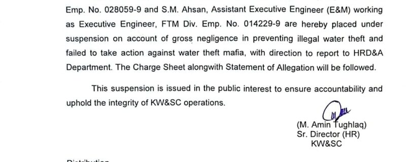میئر کراچی کی ہدایت پر سی ای او واٹر نے فوری ایکشن لیتے ہوئے پانی چوری میں ملوث دو افسران کو معطل کردیا، ایگزیکٹو انجینئر ایف ٹی ایم ایس ایم احسن اور ایگزیکٹو انجینئر سی ٹی ایم احسان اللہ شیخ کو معطل کردیا گیا، واٹر کارپوریشن کے ایچ آر ڈپارٹمنٹ نے دونوں افسران کی معطلی کا نوٹیفکیشن جاری کردیا،
