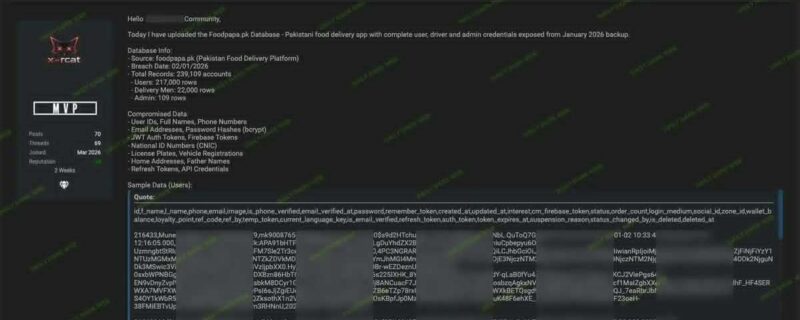 اسلام آباد(ایچ آراین ڈبلیو) پاکستان میں فوڈ ڈیلیوری سے متعلق پلیٹ فارم فوڈپاپا کا ڈیٹا مبینہ طور پر ڈارک ویب پر لیک ہونے کا انکشاف ہوا ہے۔مجموعی طور پر 239,109 اکاؤنٹس متاثر ہوئے ہیں جن میں صارفین، ڈرائیورز اور ایڈمنسٹریٹرز کی معلومات شامل ہیں۔