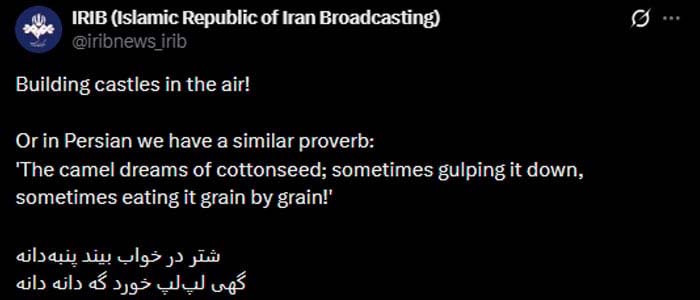 پوسٹ میں فارسی کا ایک محاورہ بھی شامل کیا گیا جس کا مفہوم یہ ہے کہ “اونٹ خواب میں بنولے کے بیج دیکھتا ہے”، جو عام طور پر غیر حقیقی خواہشات یا ناممکن خوابوں کے لیے استعمال کیا جاتا ہے۔