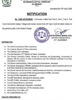 اعلامیے کے مطابق ٹریل 2، ٹریل 3، ٹریل 4، ٹریل 5 اور سیدپور گاؤں کے عقب میں واقع ٹریل کو آج (20 اپریل 2026) سے تاحکمِ ثانی عام شہریوں کے لیے بند رکھا جائے گا۔