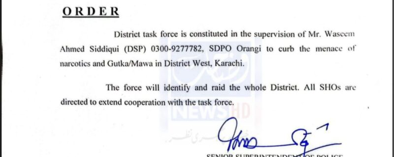 **کراچی (ایچ آراین ڈبلیو):** کراچی کے ڈسٹرکٹ ویسٹ میں منشیات کی بڑھتی ہوئی لعنت کی روک تھام اور منشیات فروشوں کے خلاف گھیرا تنگ کرنے کے لیے ایک خصوصی ٹاسک فورس تشکیل دے دی گئی ہے۔ اس اہم ذمہ داری کے لیے ڈی ایس پی وسیم احمد صدیقی کو ٹاسک فورس کا انچارج مقرر کیا گیا ہے۔