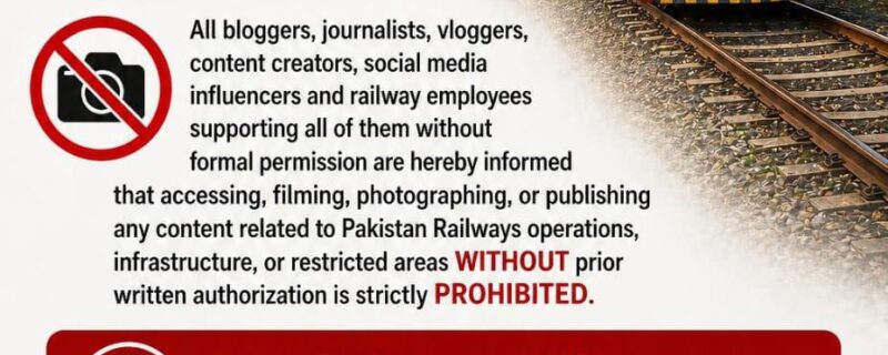 **لاہور/کراچی (ایچ آراین ڈبلیو):** پاکستان ریلوے نے قومی اثاثوں کی حفاظت اور سیکیورٹی اقدامات کو مزید سخت کرتے ہوئے ریلوے اسٹیشنز، پلیٹ فارمز اور یارڈز میں بغیر اجازت خبر سازی، فوٹو گرافی اور ویڈیو گرافی کو جرم قرار دے دیا ہے۔ ریلوے حکام کی جانب سے صحافیوں، وی لاگرز، بلاگرز اور عام عوام کے لیے نئی ہدایات جاری کر دی گئی ہیں۔