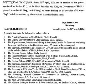 نوٹیفکیشن میں کہا گیا ہے کہ لیبر ڈے کی چھٹی کا اطلاق لوکل کونسلز اور کارپوریشنز پر بھی ہوگا۔تاہم ضروری خدمات فراہم کرنے والے ادارے معمول کے مطابق کھلے رہیں گے۔چیف سیکرٹری سندھ آصف حیدر شاہ کی منظوری کے بعد باقاعدہ نوٹیفکیشن جاری کیا گیا ہے۔