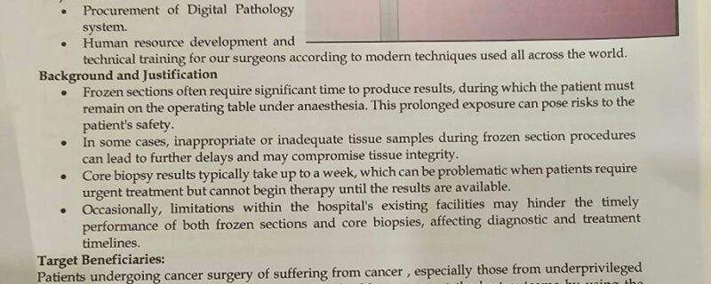 اس مقصد کیلئے جدید مشینری و آلات خرید کر نصب کئے جائیں گے جس کے بعد انہیں فعال کیا جائے گا، ڈجیٹل پیتھالوجی سسٹم نصب کرنے کا مقصد کینسر کے مرض کی تشخیص کرنا اور فوری علاج کرنا ہے